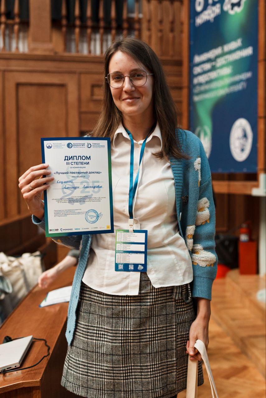 Аспирантка 4 года обучения, Саулина Александра Александровна — победительница конкурса стендовых докладов в номинации лучший постерный доклад III степени с докладом: “Получение рекомбинантного WGR-домена PARP2 человека и исследование его влияния на структуру нуклеосом”