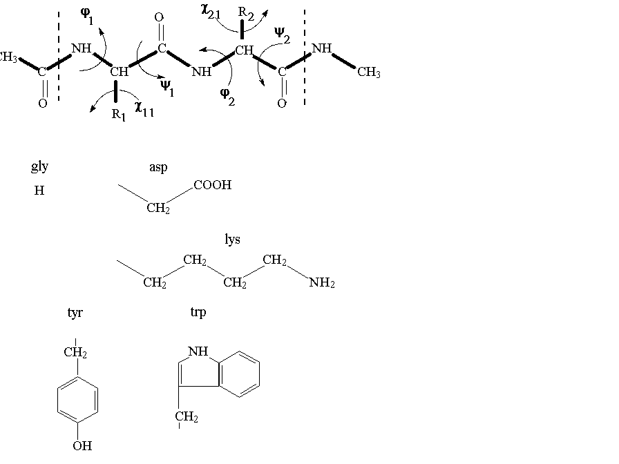 Рис.1. 1- структура фрагмента пептидной цепи и обозначения двугранных (торсионных) углов. При моделировании динамики пептидов для устранения концевых эффектов обычно с N – конца присоединяют ацетил, с С- конца – метиламин (отделены от основной цепи пунктирами). 2 – примеры боковых радикалов в природных аминокислотах: gly – глицин, asp – аспарагиновая кислота, lys – лизин, tyr – тирозин, trp – триптофан.