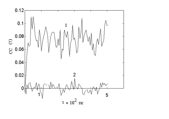 (2) в дипептиде gly-asp (см. рис.1). Из вида кросскорреляционных функций следует, что первая пара углов хорошо коррелирует при движении даже на временах порядка 500 пс. Между второй парой углов корреляция практически