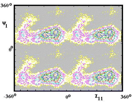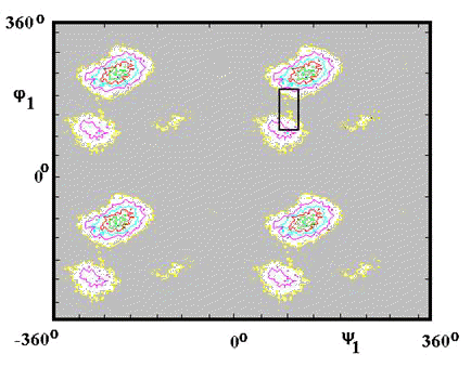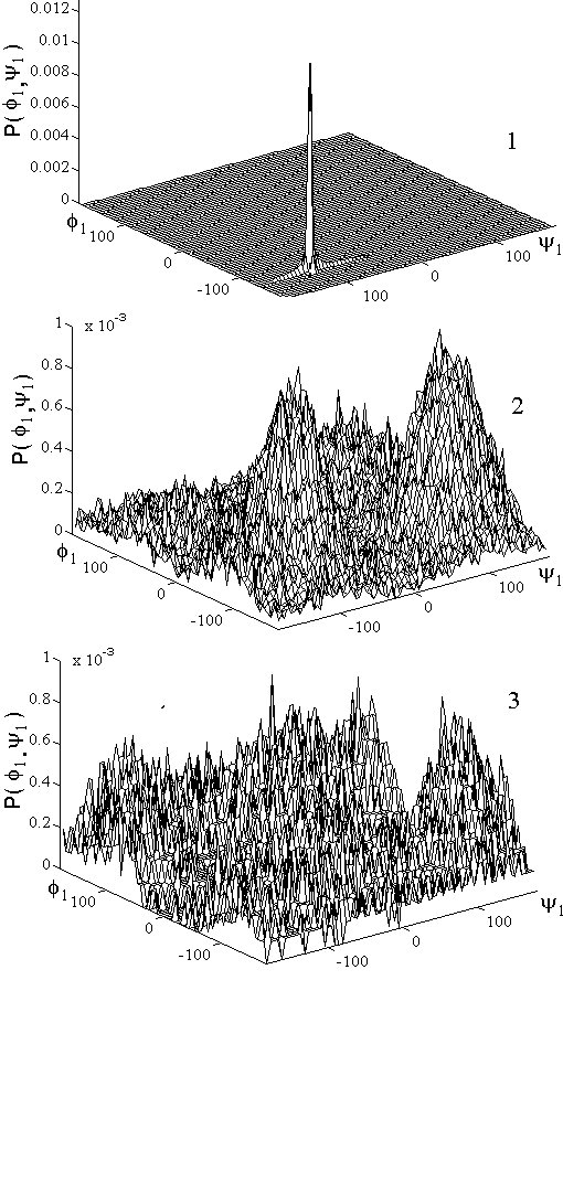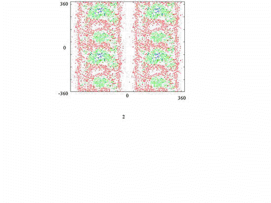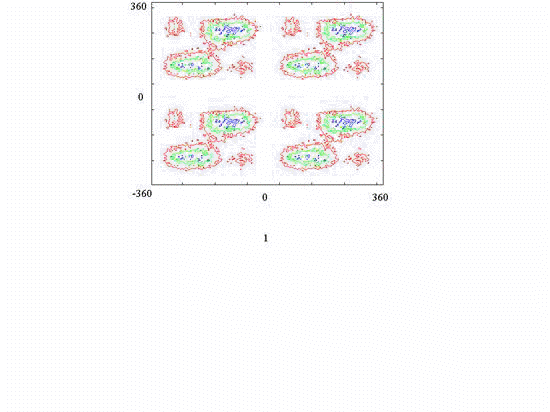 Степень корреляции конформационных степеней свободы тесно связана со структурой поверхности потенциальной энергии. Ниже мы иллюстрируем это обстоятельство с помощью карт уровней свободной энергии пептидов. Рассмотрим это подробнее. Из траекторного файла можно определить относительную частоту или вероятность реализации конформаций молекулы P(a1,a2,…, an). Если при фиксированных значениях двух углов, например, a1 и a2 просуммировать P по всем остальным значениям углов, то мы получим вероятность реализации состояния с определенными значениями переменных a1 и a2. Согласно известной формуле Больцмана, логарифм этой вероятности, умноженный на (-kBT) равен величине свободной энергии данного состояния F. Напомним, что свободная энергия отличается от внутренней энергии U на величину, пропорциональную энтропии S данного состояния: F=U-TS. Энтропия состояния пропорциональна логарифму объема фазового пространства, соответствующего данному состоянию. Чем ниже потенциальная энергия и выше энтропия состояния системы с фиксированными значениями a1 и a2, тем ниже будет соответствующее значение свободной энергии. Таким образом, поверхность свободной энергии (или карта уровней свободной энергии) дает наглядное представление о разделении при заданной температуре областей конфигурационного пространства на доступные и малодоступные области. Доступные области - с низкой потенциальной энергией и относительно большим фазовым объемом. Малодоступные области - с более высокой потенциальной энергией и (или) низкой энтропией. В определенной степени, можно считать, что карта уровней свободной энергии дает интегральную характеристику проекции энергетической поверхности системы на плоскость переменных a1 и a2.